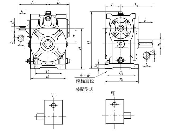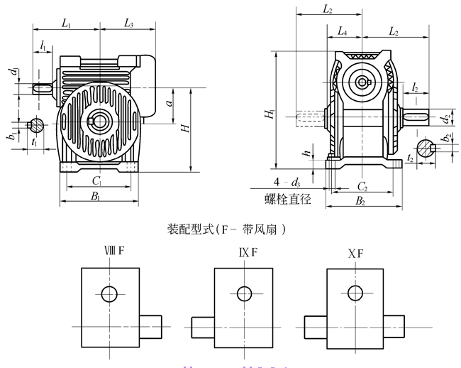 KWO錐面包絡圓柱蝸桿減速機的外形、安裝尺寸和裝配型式            (mm)