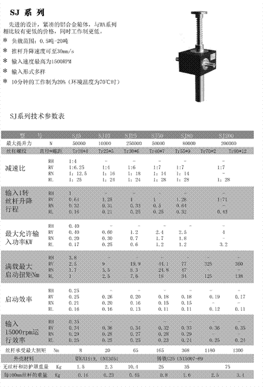 SJ螺旋升降機先進(jìn)的設(shè)計,緊湊的鋁齒輪箱體,與 MA系列有更低的價格額定負(fù)載: 0.5噸 - 20噸 推桿升降速度可至30mm/s 最高輸入轉(zhuǎn)速:1500rpm 工作制:20%(10分鐘運行2分鐘)可選擇雙頭,三頭絲杠配套,參數(shù)咨詢我公司附件:齒隙抵消裝置,防轉(zhuǎn)轉(zhuǎn)置,安全螺母,防塵罩,磁感應(yīng)限位開關(guān) MA系列普通齒螺旋升降機