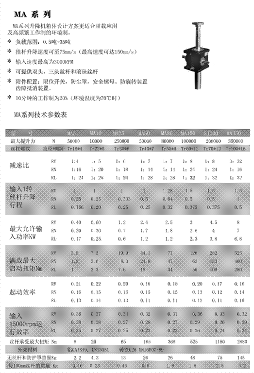 SJ螺旋升降機先進(jìn)的設(shè)計,緊湊的鋁齒輪箱體,與 MA系列有更低的價格額定負(fù)載: 0.5噸 - 20噸 推桿升降速度可至30mm/s 最高輸入轉(zhuǎn)速:1500rpm 工作制:20%(10分鐘運行2分鐘)可選擇雙頭,三頭絲杠配套,參數(shù)咨詢我公司附件:齒隙抵消裝置,防轉(zhuǎn)轉(zhuǎn)置,安全螺母,防塵罩,磁感應(yīng)限位開關(guān) MA系列普通齒螺旋升降機 更適合重載應(yīng)用:重負(fù)荷,高頻繁工作制 額定負(fù)載: 0.5噸 -35噸 推桿升降速度可至75mm/s 最高輸入轉(zhuǎn)速: 3000rpm 工作制:30%(10分鐘運行3分鐘)