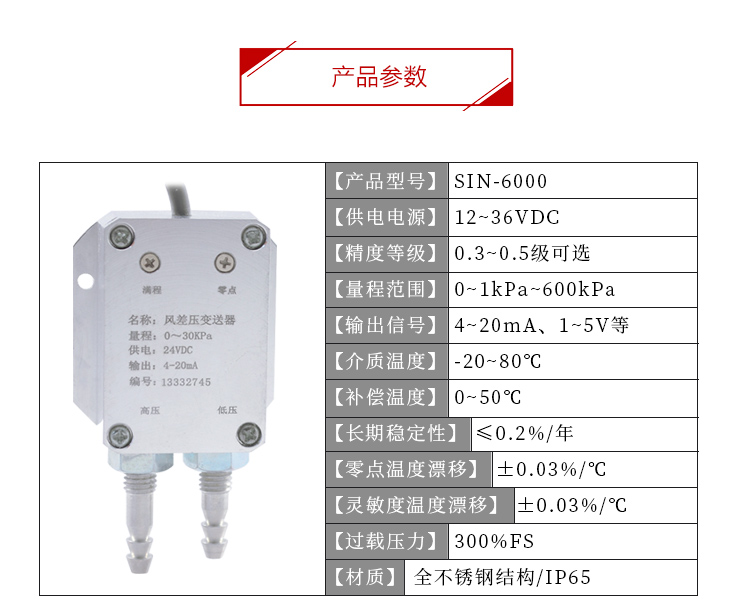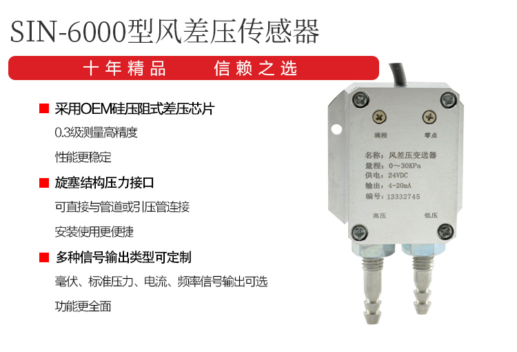 SIN6000型風差壓傳感器采用OEM硅壓阻式差壓芯體組裝而成。外殼為鋁合金結(jié)構(gòu)兩個壓力接口為M10螺紋和旋塞結(jié)構(gòu)(用戶可選擇壓力接口尺寸),可直接在測量管道上或通過引壓管連接。SIN6000型有毫伏、標準電壓、電流、頻率信號輸出等可供選擇,安裝使用方便,廣泛應用于鍋爐送風、井下通風等電力、煤炭行業(yè)壓力過程控制領(lǐng)域。