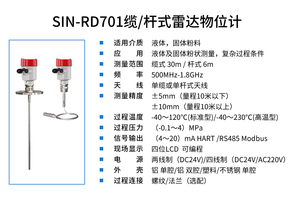 聯(lián)測SIN-RD701纜/桿式雷達物位計是適用于液體及固體粉狀。雷達液位計天線發(fā)射及窄的微波脈沖,這個脈沖以光速在空間傳播,遇到被測介質表面,其部分能量被反射回來,被同一天線接收。發(fā)射脈沖與接收脈沖的時間間隔與天線到被測介質表面的距離成正比,多用于水位、料位與化工場合。
