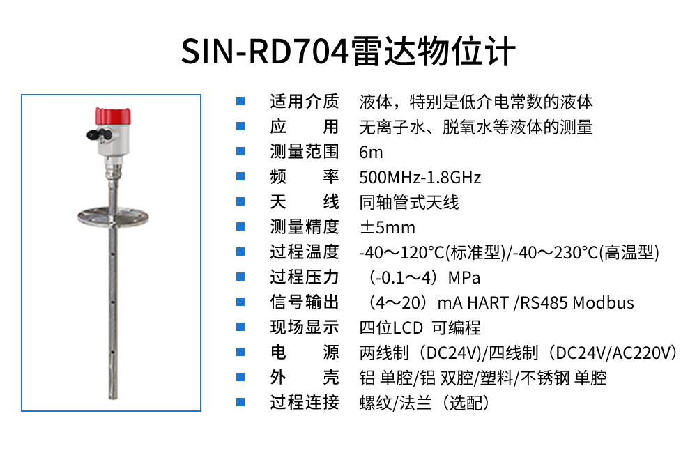 聯測SIN-RD704雷達液位計,適用于無離子水、脫氧水等液體。雷達液位計天線發射及窄的微波脈沖,這個脈沖以光速在空間傳播,遇到被測介質表面,其部分能量被反射回來,被同一天線接收。發射脈沖與接收脈沖的時間間隔與天線到被測介質表面的距離成正比,多用于水位、料位與化工場合。