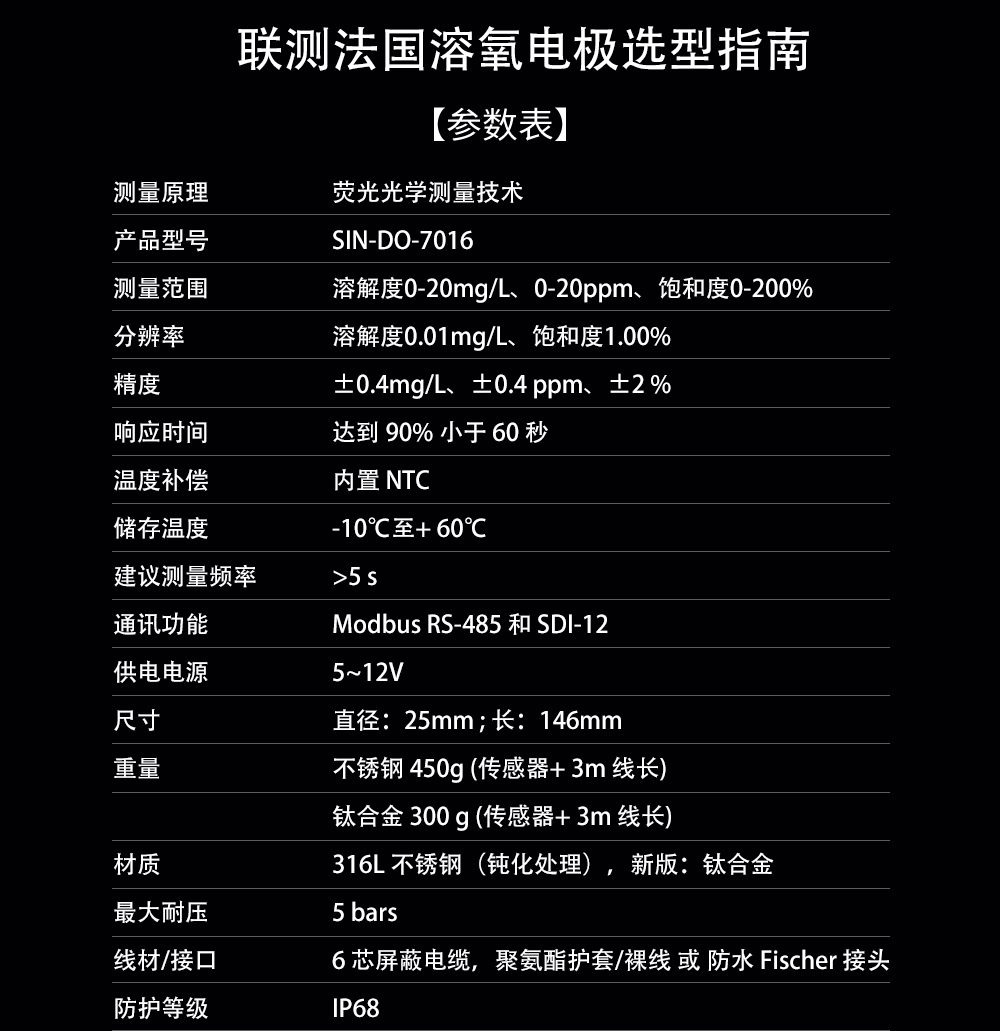 聯(lián)測_SIN-DO-7016法國進口在線熒光法溶解氧電極,曝氣池DO溶氧測定儀水含氧量監(jiān)測儀電極。SIN-DO-7016熒光法溶解氧傳感器是基于熒光猝熄原理,綠光照射到熒光物質(zhì)時使熒光物質(zhì)激發(fā)并發(fā)出紅光,由于氧分子可帶走能量,所以激發(fā)的紅光的時間與氧分子的濃度成反比,通過測量紅光的持續(xù)時間就可以計算溶解氧的濃度。傳感器已通過美國材料與試驗協(xié)會國際試驗方D888-05的認證。無須校準并在設計中兼顧了超低能耗,傳感器能夠滿足現(xiàn)場作業(yè)以及長期或短期測試的所有需求。在不消耗氧氣的前提下,針對所有測量環(huán)境,尤其是氧