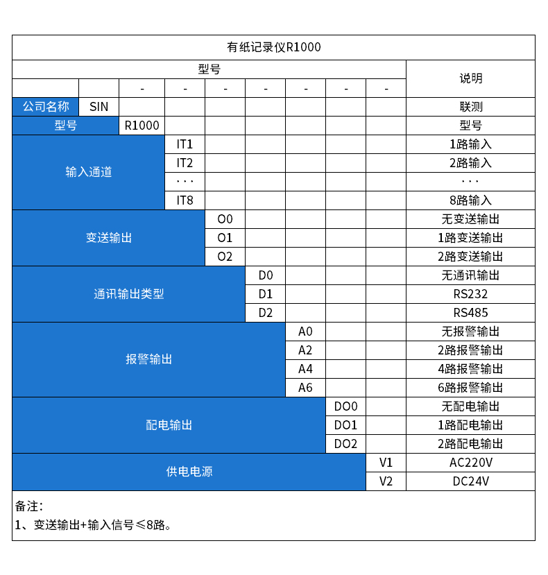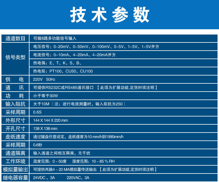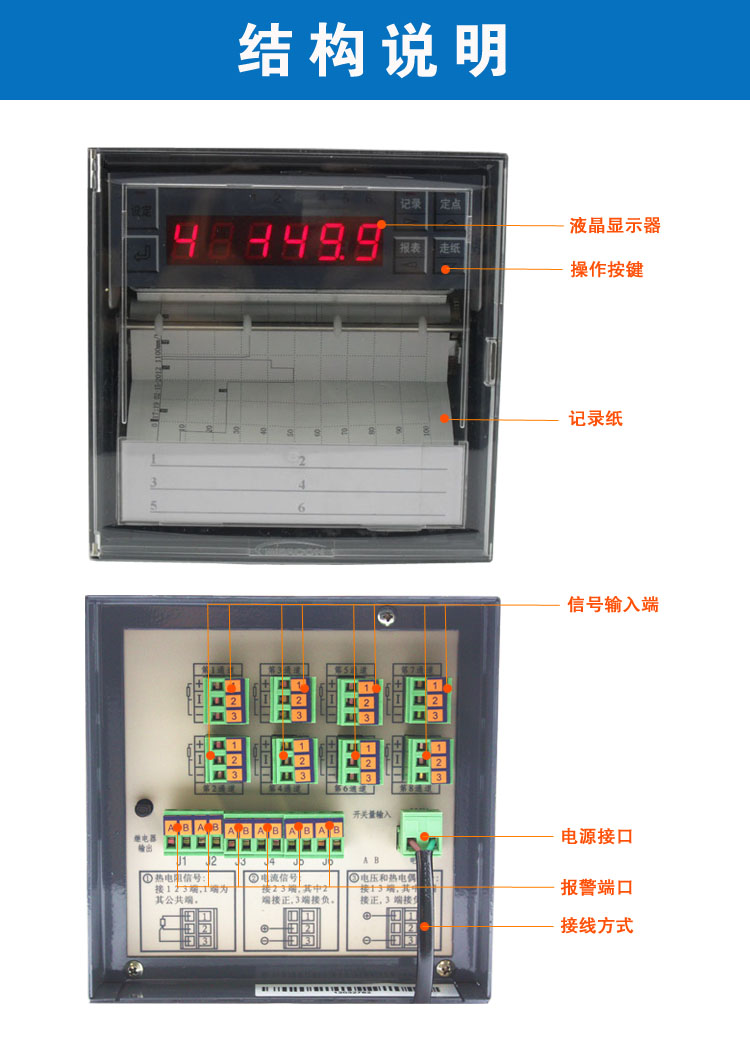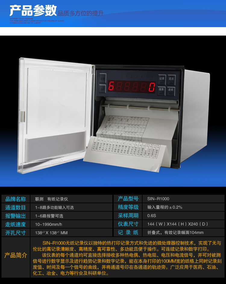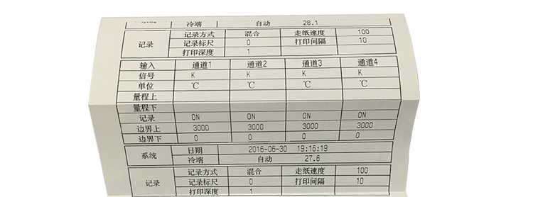 SIN-R1000有紙溫度記錄儀最多具有8路輸入通道,2路模擬量輸出,通道之間采用點點隔離;均可直接選擇接收多種熱電偶、熱電阻、壓力變送器、電壓、電流信號,并可對被測信號進行數(shù)字顯示及進行趨勢記錄和數(shù)字記錄,能在本身打印的120mm寬的紙格上同時記錄刻度值、時間及每一個信號的曲線,并將通道號印在各通道的軌跡旁。
