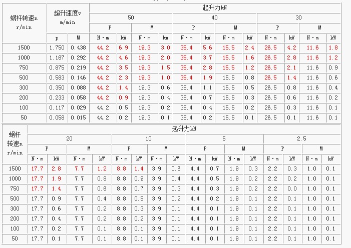 SWL5蝸輪絲桿升降機(jī)輸入功率0.1-6.9KW,按實(shí)際起重總量按下表選擇合適的輸入功率,表中的參數(shù)適用于環(huán)境溫度為20℃、工作持續(xù)率為20%h或30%/10min的條件下; 對(duì)紅色的參數(shù),使用時(shí)螺桿會(huì)產(chǎn)生過熱,應(yīng)嚴(yán)加注意。